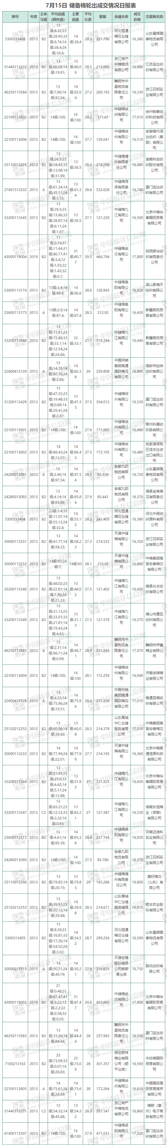 7月15日儲備棉輪出銷售資源9537.787噸,實際成交9537.787噸,成交率100%,成交均價16795元/噸,較14日上漲4元/噸,折3128價格17989元/噸,較14日下跌45元/噸。