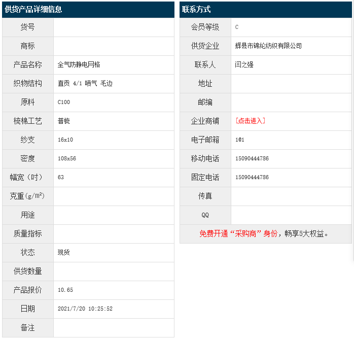 7月20日,輝縣錦綸紡織有限公司純棉防靜電網(wǎng)格OEC100 16x10 108x56 63" 直貢 4/1 噴氣 毛邊,報(bào)價(jià)為10.65元/米,實(shí)際成交價(jià)以協(xié)商為準(zhǔn)。[點(diǎn)擊查看詳情]
