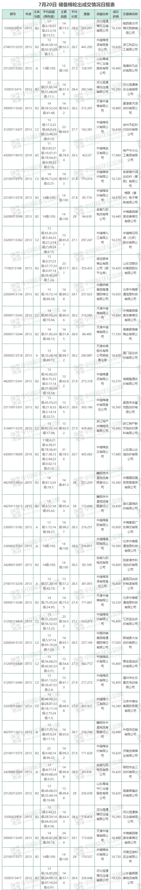 7月20日儲備棉輪出銷售資源9517.18噸,實(shí)際成交9517.18噸,成交率100%,成交均價16652元/噸,較19日下跌43元/噸,折3128價格17809元/噸,較19日下跌109元/噸。