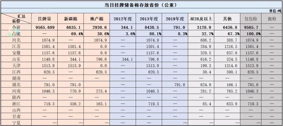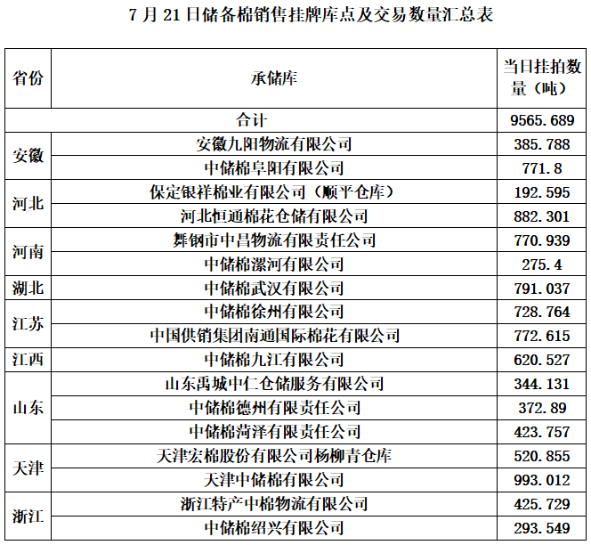 中國儲備棉管理有限公司定于7月21日上市銷售儲備棉重量9565.689噸,共41捆,其中新疆棉6635.11噸。