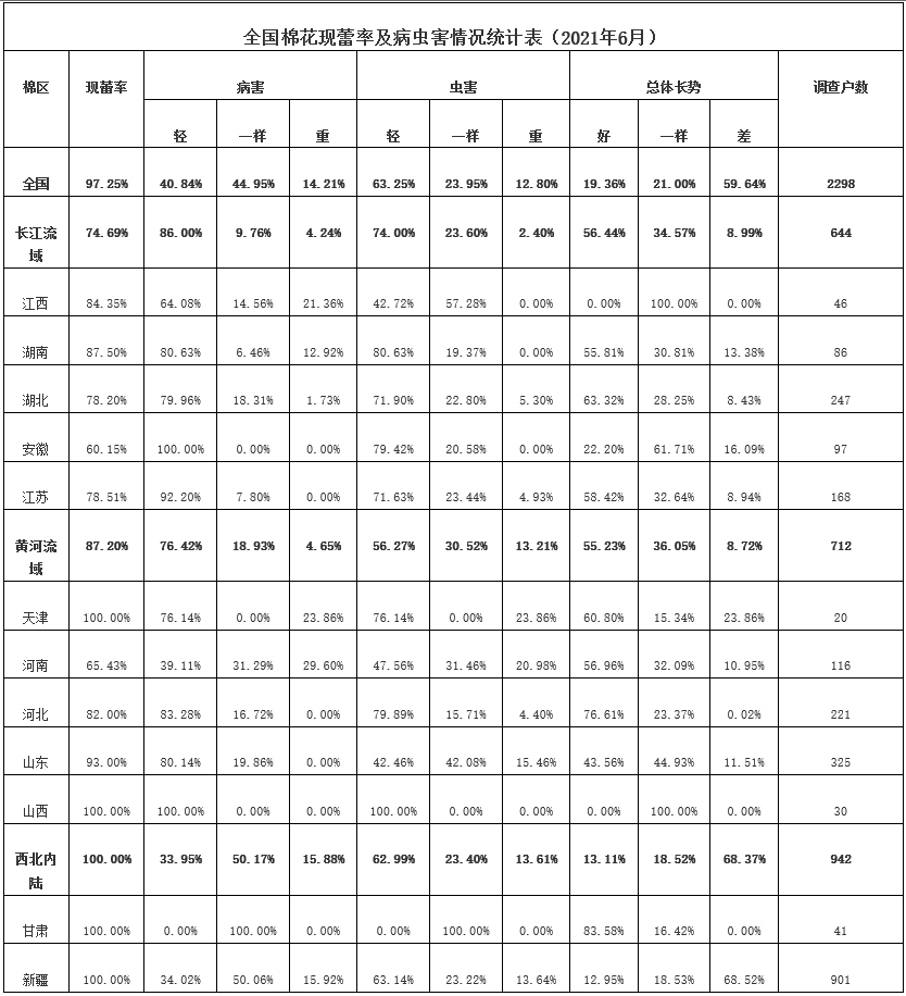 2021年6月中國棉花協(xié)會(huì)棉農(nóng)分會(huì)對(duì)內(nèi)地12個(gè)省市和新疆自治區(qū)2298個(gè)定點(diǎn)農(nóng)戶進(jìn)行了植棉情況調(diào)查。調(diào)查結(jié)果顯示:全國植棉面積為4345.59萬畝,同比減少5.47%,預(yù)計(jì)單產(chǎn)同比略增,總產(chǎn)量約為572.18萬噸,同比減少3.41%。