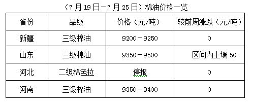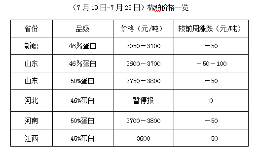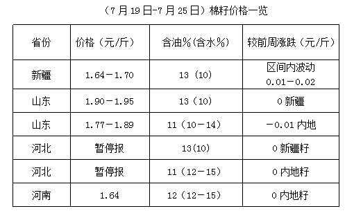 上周(7月19-25日),受棉籽原料不足和市場震蕩難穩(wěn)等諸多因素影響,各地油棉加工逐步進(jìn)入尾聲,棉籽、棉副行情高位震蕩為主,季節(jié)性特點(diǎn)明顯。油棉廠根據(jù)當(dāng)?shù)貙?shí)際供求調(diào)整價格,整體易漲難跌,新棉籽上市前,棉副行情保持高位震蕩調(diào)整格局運(yùn)行。