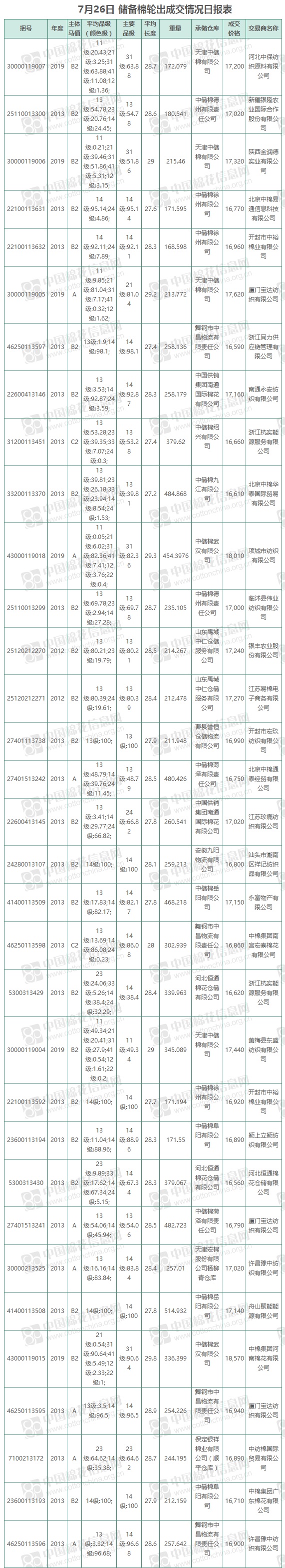 7月26日儲(chǔ)備棉輪出銷售資源9568.53噸,實(shí)際成交9568.53噸,成交率100%,成交均價(jià)17045元/噸,較23日上漲37元/噸,折3128價(jià)格18036元/噸,較23日下跌78元/噸。