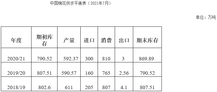 6月,全國(guó)氣象條件較適宜棉花生長(zhǎng),但新疆棉花受前期低溫凍害影響生長(zhǎng)遲緩,長(zhǎng)勢(shì)差于去年同期。據(jù)中國(guó)棉花協(xié)會(huì)調(diào)查,2021年度全國(guó)棉花預(yù)計(jì)總產(chǎn)量約為572.18萬噸,同比減少3.41%。本月紡織企業(yè)訂單充足,開工率維持高位,原料需求旺盛,國(guó)內(nèi)棉價(jià)穩(wěn)中有漲,紗線產(chǎn)量增長(zhǎng),企業(yè)銷售順暢,商業(yè)庫存繼續(xù)下降。國(guó)家有關(guān)部門發(fā)布公告,為優(yōu)化中央儲(chǔ)備棉結(jié)構(gòu),確保質(zhì)量良好,2021年將對(duì)部分中央儲(chǔ)備棉進(jìn)行輪出,總量安排60萬噸左右。中國(guó)棉花協(xié)會(huì)預(yù)計(jì),2020/21年度棉花進(jìn)口量為300萬噸,同比增長(zhǎng)87%;期末庫存為870萬噸,同比增長(zhǎng)10%;消費(fèi)量為810萬噸,同比增長(zhǎng)5.9%;產(chǎn)量為592萬噸,同比持平略增。