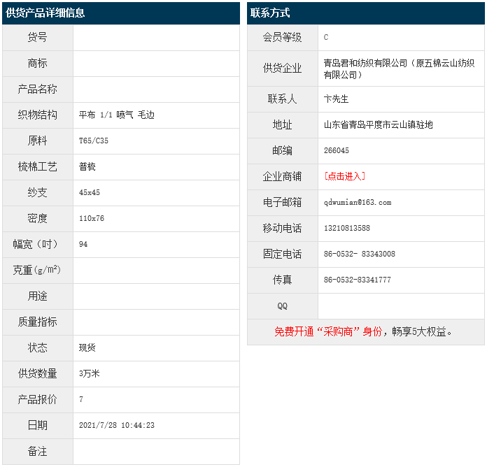 7月28日,青島君和紡織有限公司(原五棉云山紡織有限公司)滌棉平布T65/C35 45x45 110x76 94" 1/1 噴氣 毛邊,報價為7元/米,實際成交價以協(xié)商為準。[點擊查看詳情]