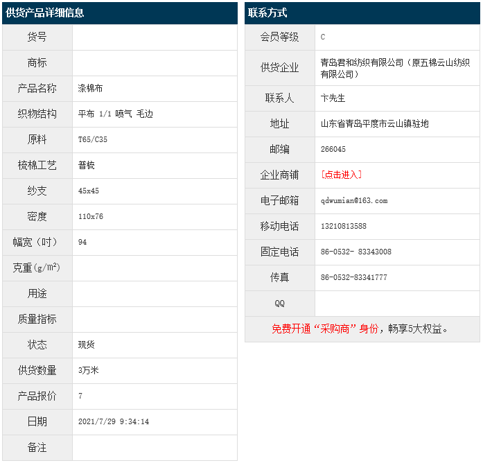 7月29日,青島君和紡織有限公司(原五棉云山紡織有限公司)滌棉平布T65/C35 45x45 110x76 94" 1/1 噴氣 毛邊,報價為7元/米,實際成交價以協(xié)商為準(zhǔn)。[點擊查看詳情]