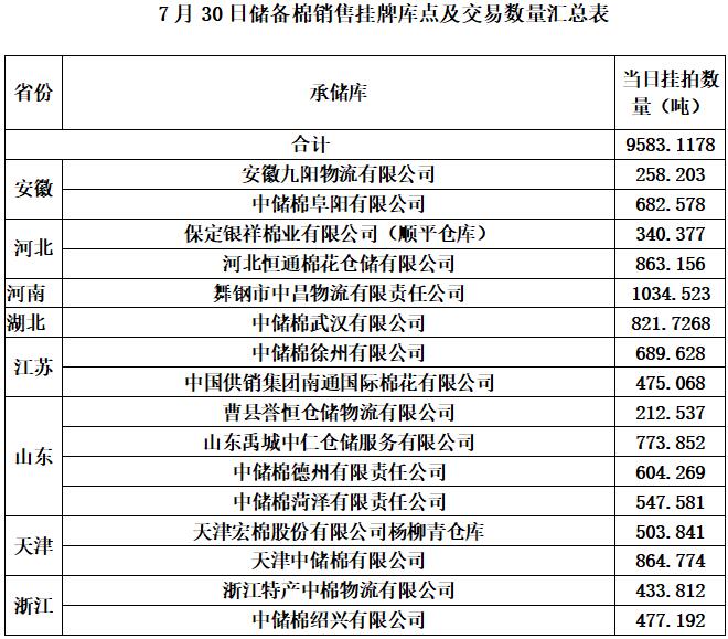 中國儲備棉管理有限公司定于7月30日上市銷售儲備棉重量9583.1178噸,共36捆,其中新疆棉6582.79噸。