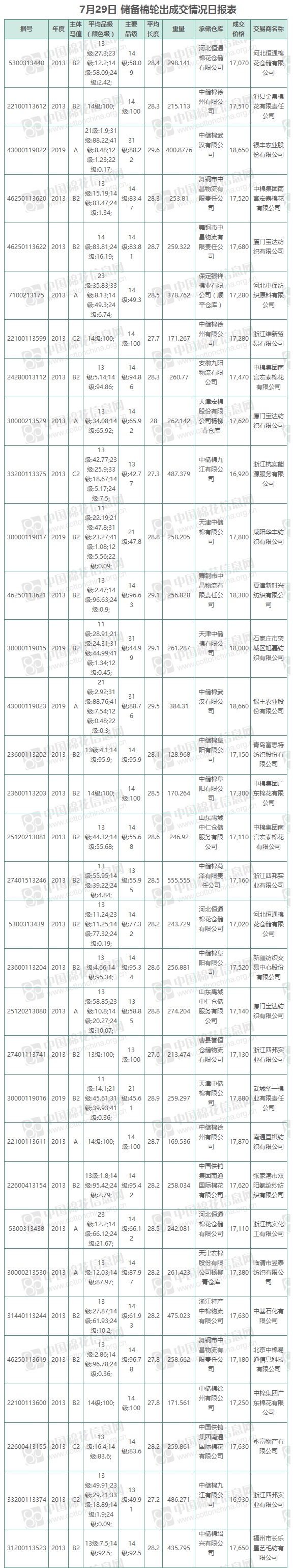 7月29日儲備棉輪出銷售資源9515.75噸,實際成交9515.75噸,成交率100%,成交均價17504元/噸,較28日上漲222元/噸,折3128價格18486元/噸,較28日上漲152元/噸。