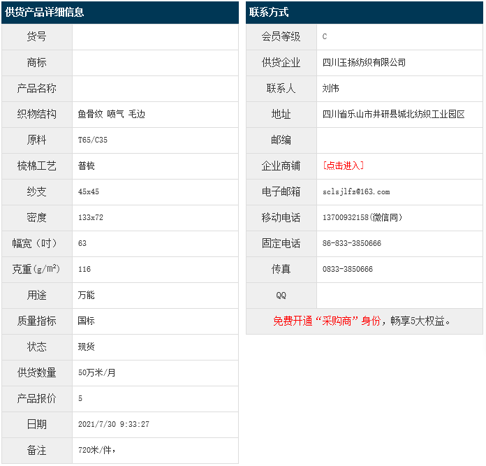 7月30日,四川玉揚(yáng)紡織有限公司滌棉魚骨紋T65/C35 45x45 133x72 63" 116g/㎡ 噴氣 毛邊,報(bào)價(jià)為5元/米,實(shí)際成交價(jià)以協(xié)商為準(zhǔn)。[點(diǎn)擊查看詳情]