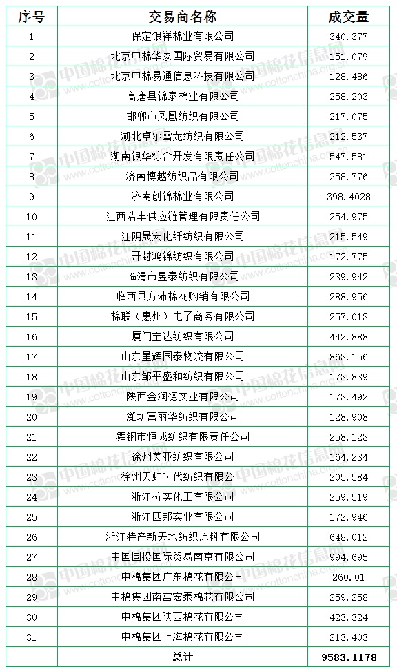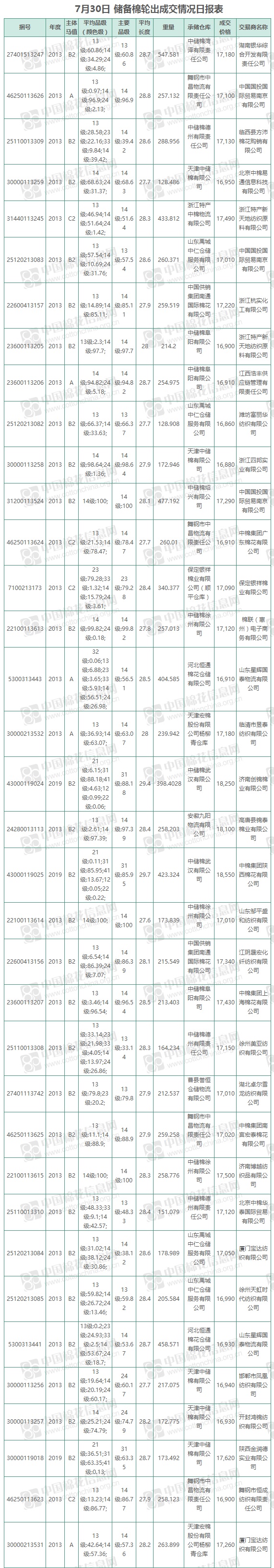 7月30日儲備棉輪出銷售資源9583.12噸,實際成交9583.12噸,成交率100%,成交均價17252元/噸,較29日下跌252元/噸,折3128價格18391元/噸,較29日下跌95元/噸。