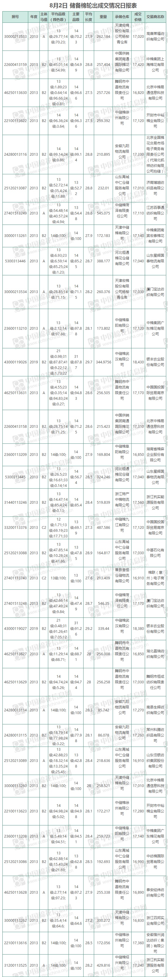 8月2日儲備棉輪出銷售資源9544.98噸,實際成交9544.98噸,成交率100%,成交均價17205元/噸,較30日下跌47元/噸,折3128價格18331元/噸,較30日下跌60元/噸。