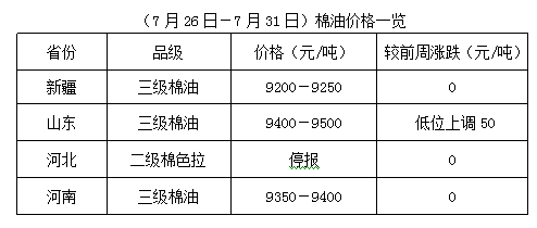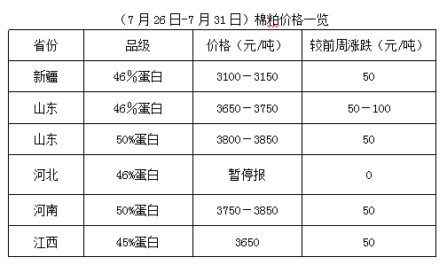 上周(7月26-31日),大豆期貨及豆類產(chǎn)品震蕩調(diào)整,棉油、棉粕現(xiàn)貨行情難以穩(wěn)定。因棉籽原料資源匱乏,棉籽整體供應(yīng)量不足,難以滿足油棉廠正常開工,部分油棉廠堅(jiān)持收購(gòu)加工,棉副產(chǎn)品因貨少持價(jià)難下,但因下游廠家高位采購(gòu)謹(jǐn)慎,成交少量,油棉廠經(jīng)營(yíng)相對(duì)冷清。