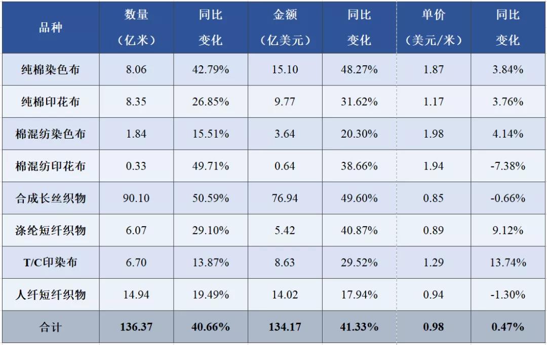 表3 2021年上半年印染八大類產(chǎn)品出口情況