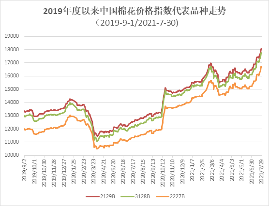 7月,儲備棉輪出成交火熱,成交率百分之百,成交價(jià)持續(xù)上漲,受此影響,國內(nèi)棉花現(xiàn)貨價(jià)格較上月大幅上漲。月內(nèi)多數(shù)紡織企業(yè)原料庫存較低,棉花需求依然較好。月底,中國棉花價(jià)格指數(shù)(CCIndex3128B)17731元/噸,環(huán)比上漲1634元/噸;月均價(jià)16945元/噸,環(huán)比上漲960元,同比上漲4987元/噸。