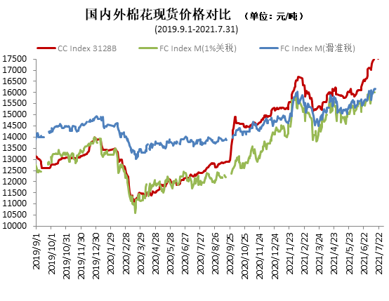 7月,國際棉花期現(xiàn)貨價(jià)格總體大幅上漲,但漲幅低于國內(nèi)棉價(jià)。中國進(jìn)口棉價(jià)格指數(shù)FCIndexM月均99.71美分/磅,環(huán)比上漲3.37美分;月底101.92美分/磅,環(huán)比上漲3.55美分,1%關(guān)稅下折人民幣16051元/噸,低于同期國內(nèi)現(xiàn)貨1680元,內(nèi)外棉價(jià)差較上月末擴(kuò)大1124元。