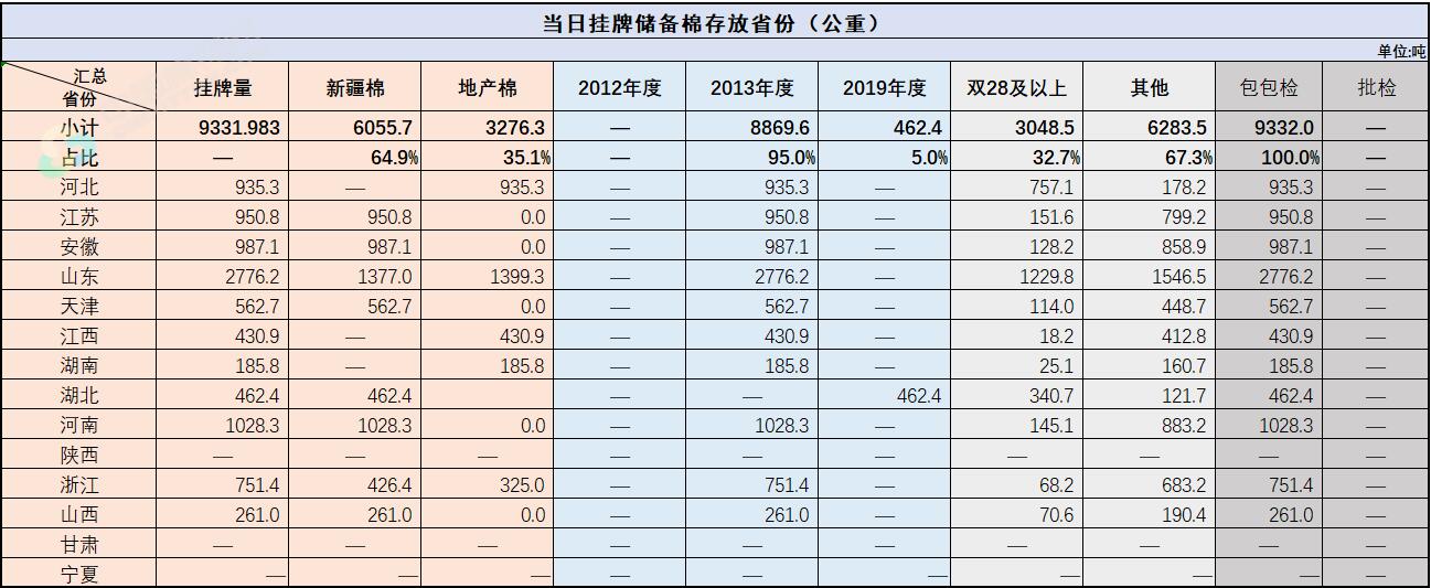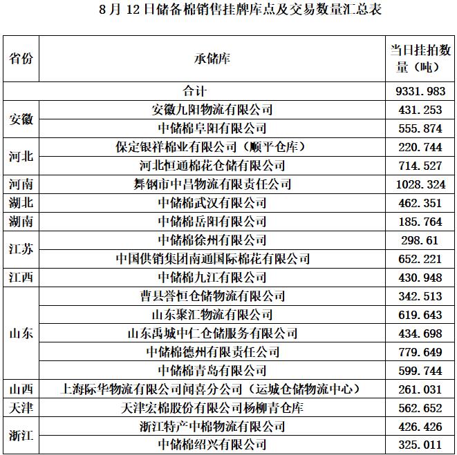 中國儲備棉管理有限公司定于8月12日上市銷售儲備棉重量9331.983噸,共41捆,其中新疆棉6055.70噸。