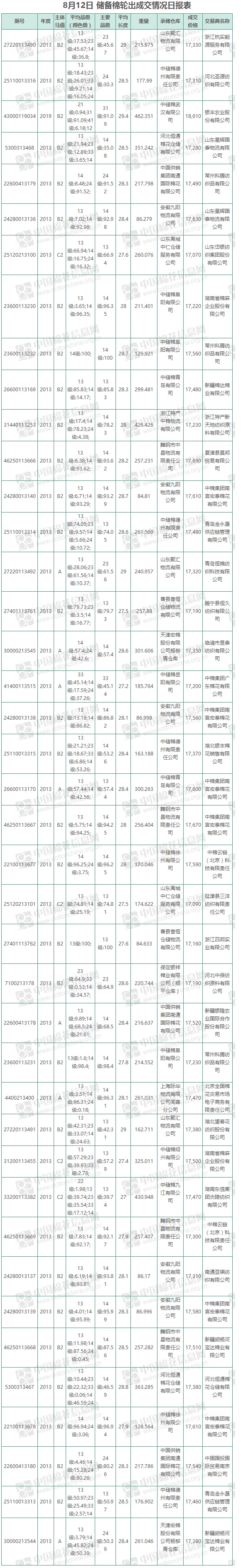 8月12日儲備棉輪出銷售資源9331.98噸,實際成交9331.98噸,成交率100%,成交均價17458元/噸,較11日下跌8元/噸,折3128價格18738元/噸,較11日下跌10元/噸。