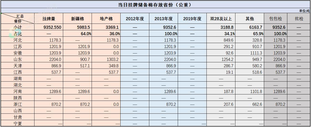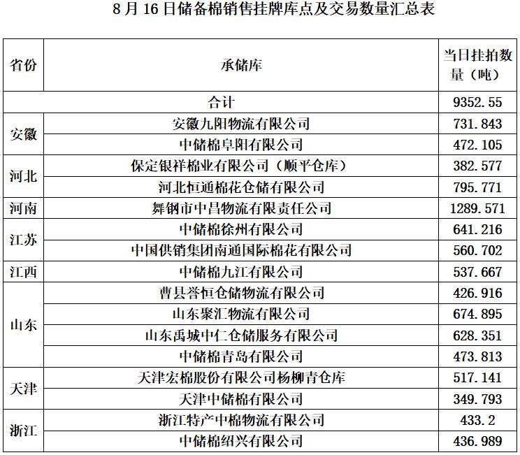 中國儲(chǔ)備棉管理有限公司定于8月16日上市銷售儲(chǔ)備棉重量9352.55噸,共44捆,其中新疆棉5983.5噸。