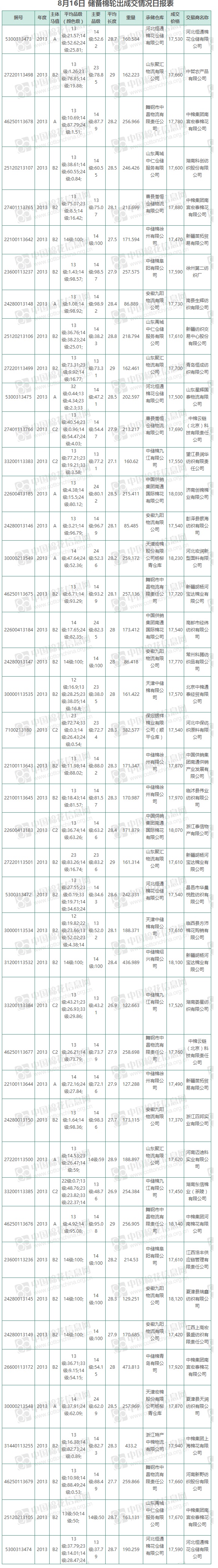 8月16日儲備棉輪出銷售資源9352.55噸,實際成交9352.55噸,成交率100%,成交均價17736元/噸,較13日上漲280元/噸,折3128價格19081元/噸,較13日上漲380元/噸。