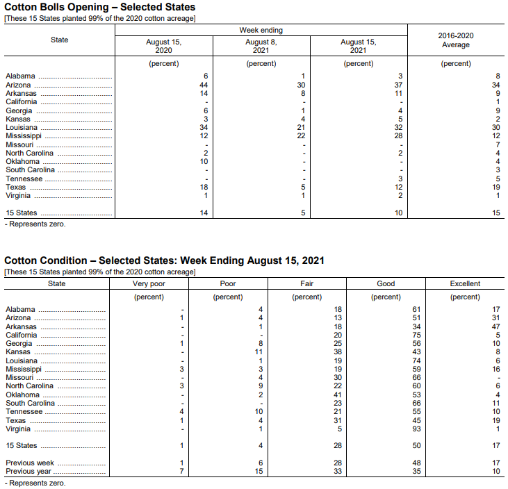 美國農(nóng)業(yè)部8月16日發(fā)布的美國棉花生長報告顯示,截至8月15日當(dāng)周,美棉現(xiàn)蕾率為93%,前周為88%,去年同期為99%,五年均值為99%。美棉結(jié)鈴率為75%,前周為63%,去年同期為79%,五年均值為82%。美棉吐絮率為10%,前周為5%,去年同期為14%,五年均值為15%。美棉生長優(yōu)良率為67%,前周為65%,去年同期為45%。