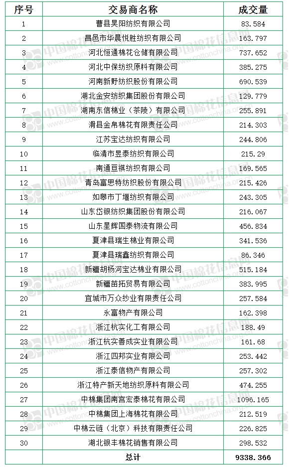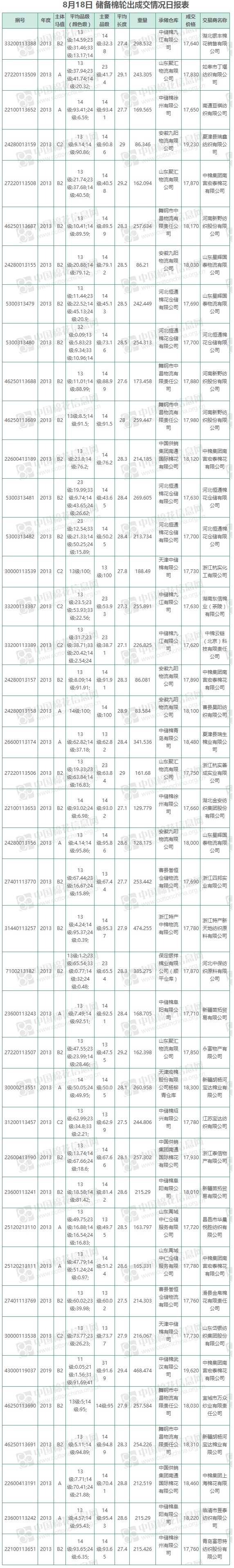 8月18日儲(chǔ)備棉輪出銷售資源9338.37噸,實(shí)際成交9338.37噸,成交率100%,成交均價(jià)17990元/噸,較17日下跌3元/噸,折3128價(jià)格19188元/噸,較17日上漲26元/噸。