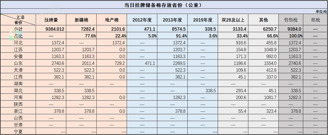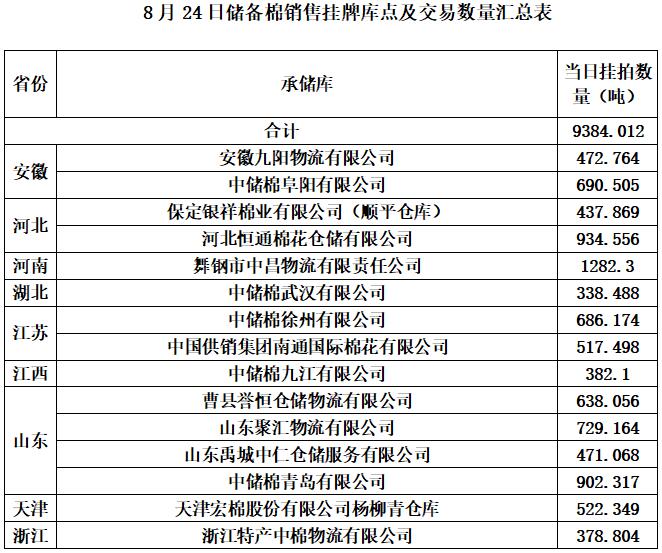 中國(guó)儲(chǔ)備棉管理有限公司定于8月24日上市銷售儲(chǔ)備棉重量9384.012噸,共43捆,其中新疆棉7282.42噸。