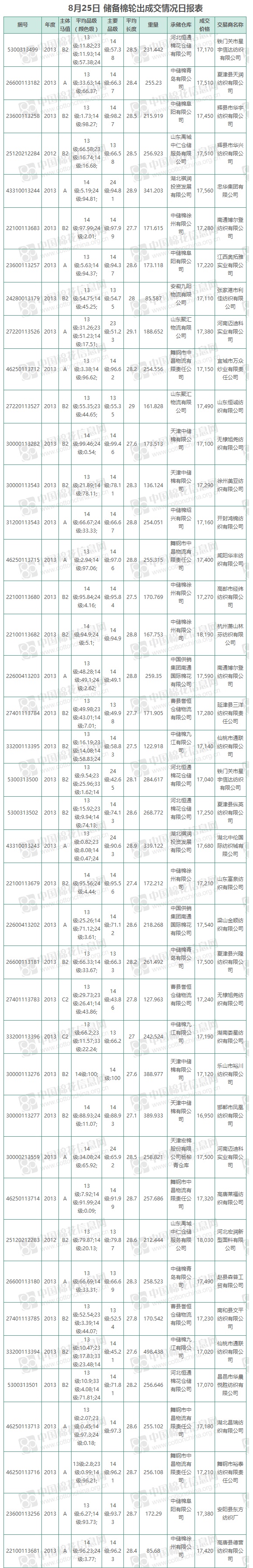 8月25日儲備棉輪出銷售資源9423.93噸,實際成交9423.93噸,成交率100%,成交均價17325元/噸,較24日上漲139元/噸,折3128價格18742元/噸,較24日上漲353元/噸。