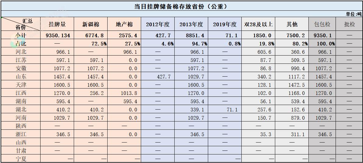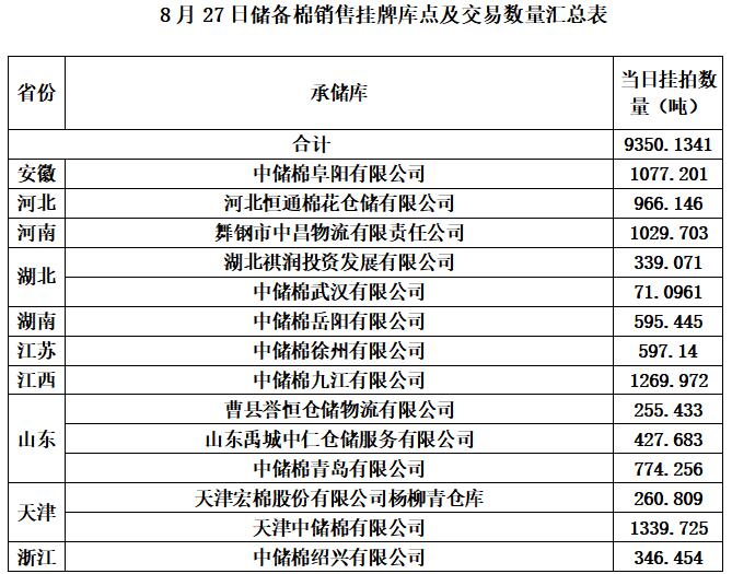 中國儲備棉管理有限公司定于8月27日上市銷售儲備棉重量9350.1341噸,共43捆,其中新疆棉6774.76噸。