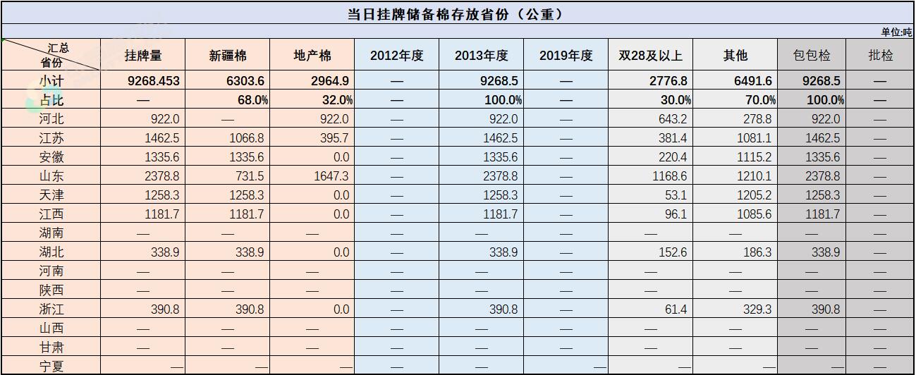 中國(guó)儲(chǔ)備棉管理有限公司定于9月1日上市銷售儲(chǔ)備棉重量9268.453噸,共40捆,其中新疆棉6303.56噸。