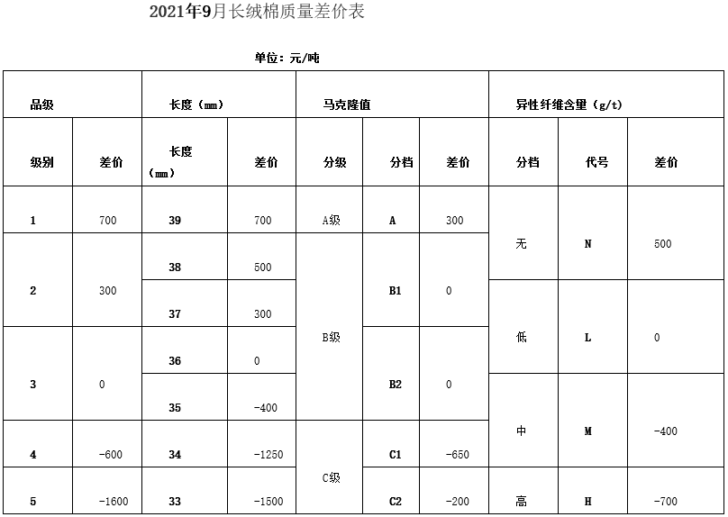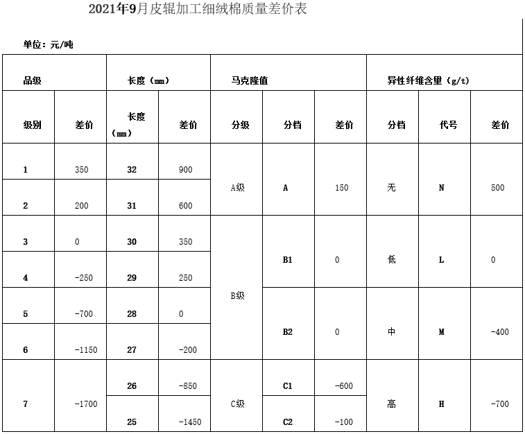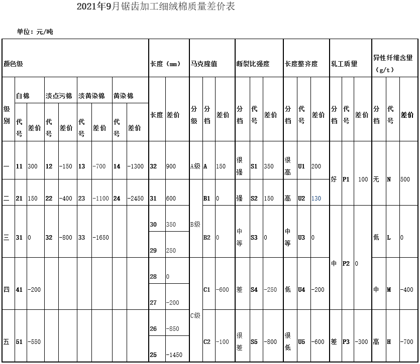 根據(jù)《中國(guó)棉花協(xié)會(huì)國(guó)產(chǎn)棉質(zhì)量差價(jià)表管理辦法》規(guī)定,現(xiàn)正式發(fā)布2021年9月《鋸齒加工細(xì)絨棉質(zhì)量差價(jià)表》、《皮輥加工細(xì)絨棉質(zhì)量差價(jià)表》和《長(zhǎng)絨棉質(zhì)量差價(jià)表》(單位:元/噸)。