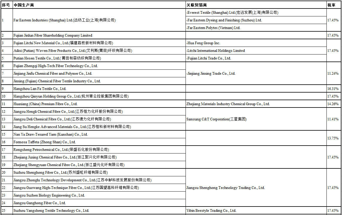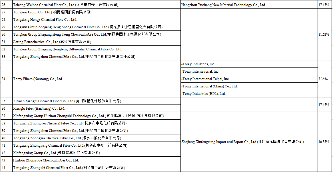 2021年9月1日,越南工貿(mào)部發(fā)布第2080/QD-BCT號(hào)決議,對(duì)進(jìn)口自中國(guó)、印度、印尼、馬來(lái)西亞的聚酯長(zhǎng)絲紗線作出反傾銷肯定性初裁,初步裁定對(duì)涉案產(chǎn)品征收臨時(shí)反傾銷稅,其中中國(guó)涉案產(chǎn)品的稅率為3.36-17.45%(詳見(jiàn)下表)、印度為54.90%、印尼為21.94%、馬來(lái)西亞為21.23%。涉案產(chǎn)品的越南稅號(hào)為5402.33.00、5402.46.00、5402.47.00。本案傾銷調(diào)查期為2019年全年,損害調(diào)查期為2017年至2019年。措施自公告發(fā)布3日起生效,有效期不超過(guò)120天。