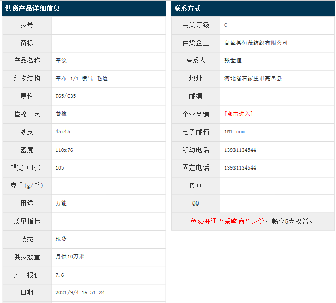 9月4日,高邑縣恒茂紡織有限公司滌棉平紋T65/C35 45x45 110x76 105" 1/1 噴氣 毛邊,報價為7.6元/米,實(shí)際成交價以協(xié)商為準(zhǔn)。[點(diǎn)擊查看詳情]