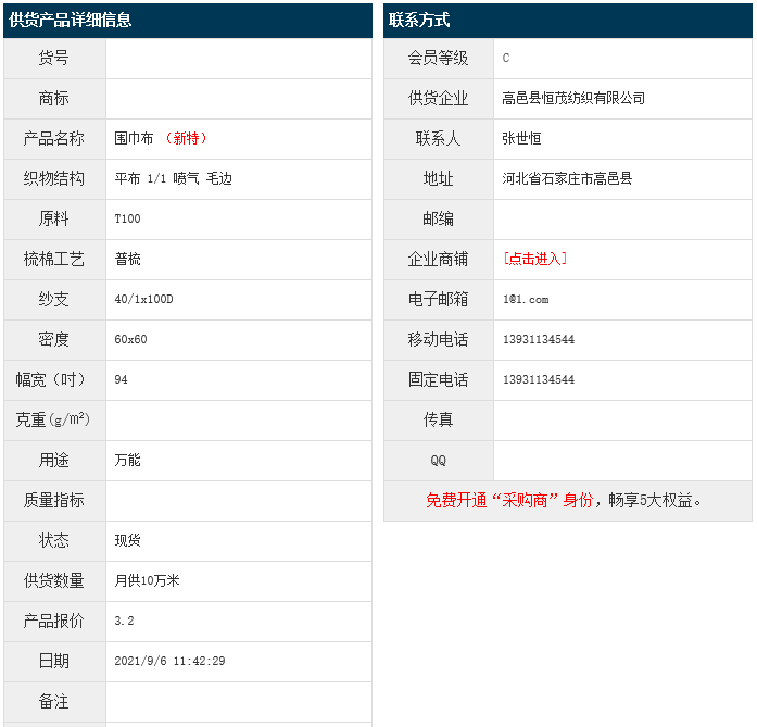 9月6日,高邑縣恒茂紡織有限公司純滌圍巾布T100 40Sx100D 60x60 94" 平布 1/1 噴氣 毛邊,報(bào)價(jià)為3.2元/米,實(shí)際成交價(jià)以協(xié)商為準(zhǔn)。[點(diǎn)擊查看詳情]