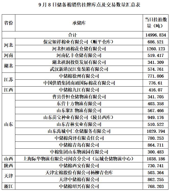 中國儲備棉管理有限公司定于9月8日通過全國棉花交易市場上市銷售中央儲備棉重量14996.834噸,共64捆,其中新疆棉8501.9噸。