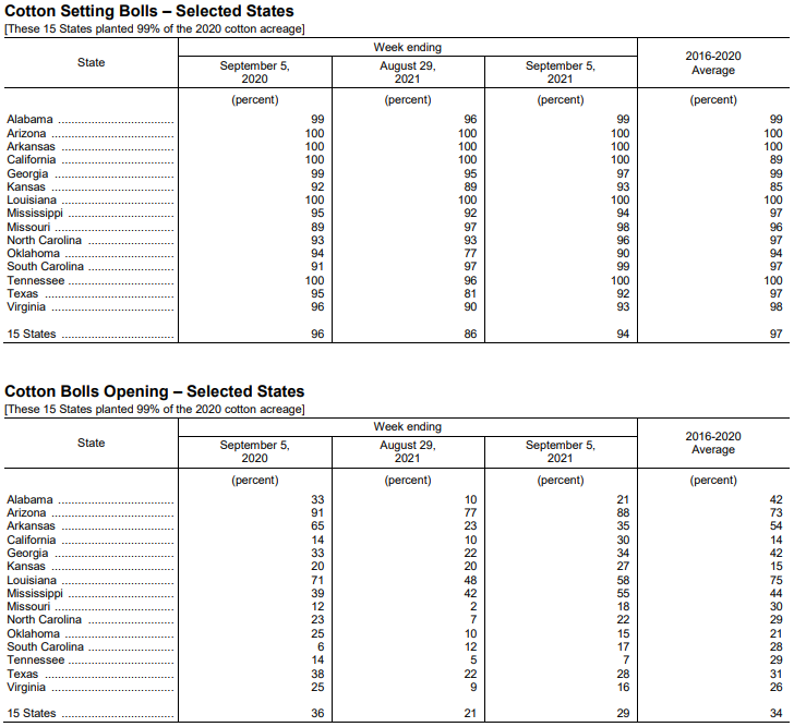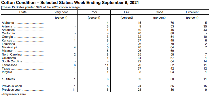 美國(guó)農(nóng)業(yè)部9月7日發(fā)布的美國(guó)棉花生長(zhǎng)報(bào)告顯示,截至9月5日當(dāng)周,美棉結(jié)鈴率為94%,前周為86%,去年同期為96%,五年均值為97%。美棉吐絮率為29%,前周為21%,去年同期為36%,五年均值為34%。美棉生長(zhǎng)優(yōu)良率為61%,前周為70%,去年同期為45%。