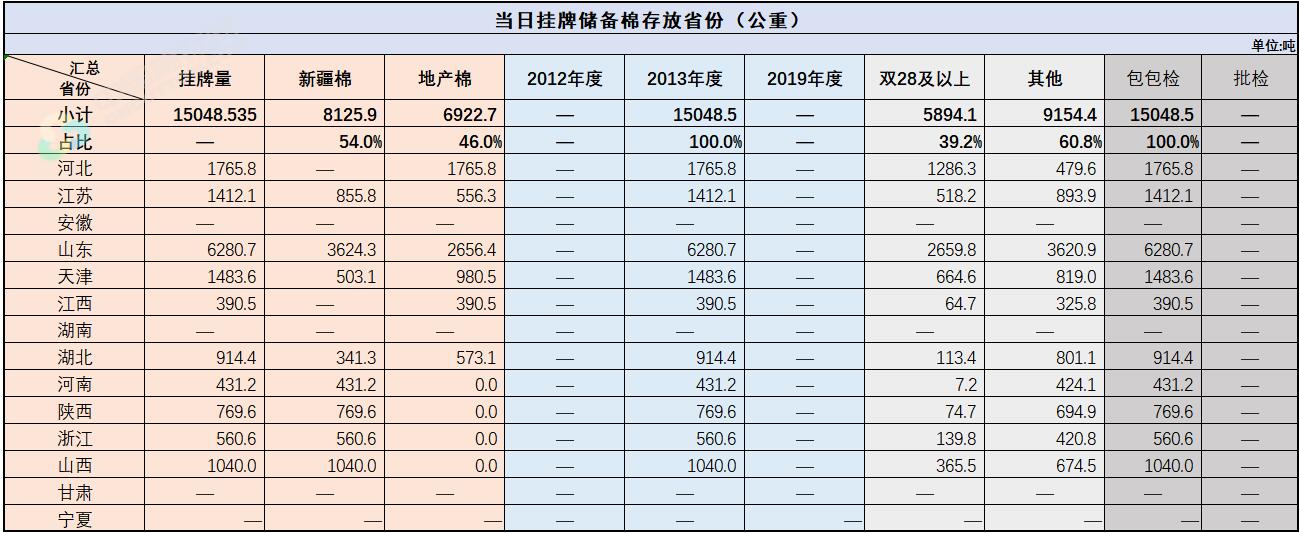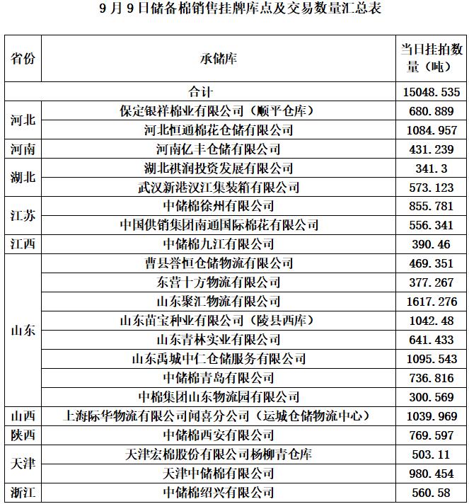 中國儲備棉管理有限公司定于9月9日通過全國棉花交易市場上市銷售中央儲備棉重量15048.535噸,共69捆,其中新疆棉8125.9噸。