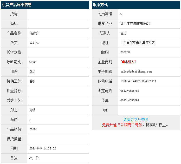 9月9日,鄒平信宏紡織有限公司針織用純棉紗C100 12S,報(bào)價(jià)為21000元/噸,實(shí)際成交價(jià)以協(xié)商為準(zhǔn)。[點(diǎn)擊查看詳情]