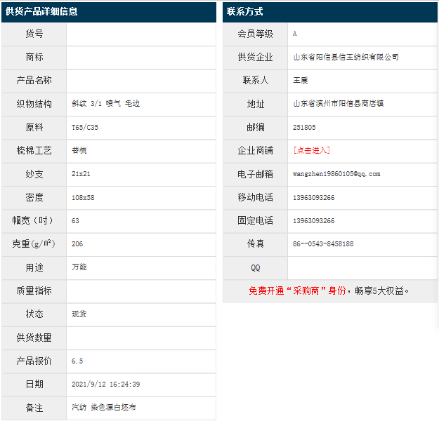 9月12日,山東陽(yáng)信縣信王紡織有限公司滌棉斜紋OET65/C35 21x21 108x58 63" 3/1 噴氣 毛邊,報(bào)價(jià)為6.5元/米,實(shí)際成交價(jià)以協(xié)商為準(zhǔn)。[點(diǎn)擊查看詳情]