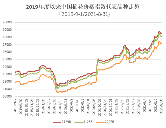 8月,儲備棉輪出成交火熱,成交率100%,成交價上漲。在期貨和儲備棉價格上漲的帶動下,棉花現(xiàn)貨價格一路沖高,8月18日創(chuàng)年度新高,價格18542元/噸。月底,國家出臺政策,限制非紡織企業(yè)競拍儲備棉,儲備棉及現(xiàn)貨成交價有所回落。月內(nèi)紡織企業(yè)需求較好,尤其月下旬價格回落之際,紡織企業(yè)采購較多。月末,中國棉花價格指數(shù)(CCIndex3128B)18127元/噸,環(huán)比上漲396元;月均價18016元/噸,環(huán)比上漲1071元,同比上漲5540元。
