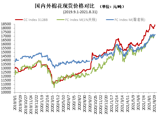 8月,國際棉花期現(xiàn)貨價格總體大幅上漲,但均價仍低于國內(nèi)棉價。中國進口棉價格指數(shù)FCIndexM月均105.05美分/磅,環(huán)比上漲5.34美分;月底107美分/磅,環(huán)比上漲5.08美分,1%關(guān)稅下折人民幣17037元/噸,低于同期國內(nèi)現(xiàn)貨1090元,內(nèi)外棉價差較上月末縮小590元。