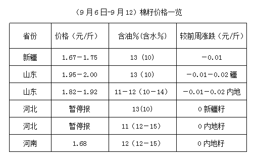 上周(9月6-12日),豆油、豆粕期貨震蕩調(diào)整,整體油強(qiáng)粕弱,現(xiàn)貨震蕩調(diào)整。各地新花少量上市,市場逢高對接,但集中上市仍需時日,油棉廠維持開工者不多,其它有意開工油棉廠設(shè)備檢修工作多已收尾,急切等待新籽上市。新榨季即將拉開帷幕,市場波動風(fēng)險加大,因當(dāng)前棉副產(chǎn)品供應(yīng)少量,廠家多持價運(yùn)行,報價參差混亂,市場購銷僵持。未來棉籽、棉副調(diào)整步伐宜密切關(guān)注新籽上市進(jìn)度。