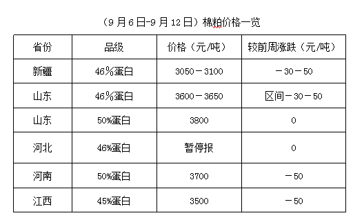 上周,期貨豆粕低位波動調(diào)整,現(xiàn)貨小幅上漲。其中大連盤2201主力合約周五收盤價至3500元/噸,較前周五收盤價3487元/噸,上調(diào)13元/噸,近期豆油廠開工有限,加之雙節(jié)來臨,豆粕現(xiàn)貨價格上漲。周末沿海地區(qū)43%蛋白豆粕價至3610-3780元/噸,較前周上漲10-50元/噸。豆粕價格有漲,棉粕持價運(yùn)行為主,但因棉籽高位有跌,新花少量上市,籽棉采摘進(jìn)度加快,市場采購者理性觀望較多,制約棉粕行情,個別開工廠家下調(diào)棉粕出貨,庫存較少者高價零售,市場報價略顯混亂。未來新籽將逐步少量上市,棉粕在參照豆粕行情走勢下,也將根據(jù)實際供求現(xiàn)狀態(tài)回歸理性價格,逐步縮小與豆粕倒掛價差,市場波動運(yùn)行難免。