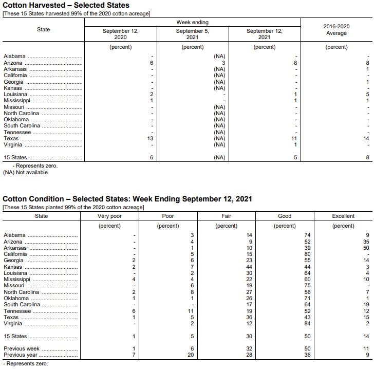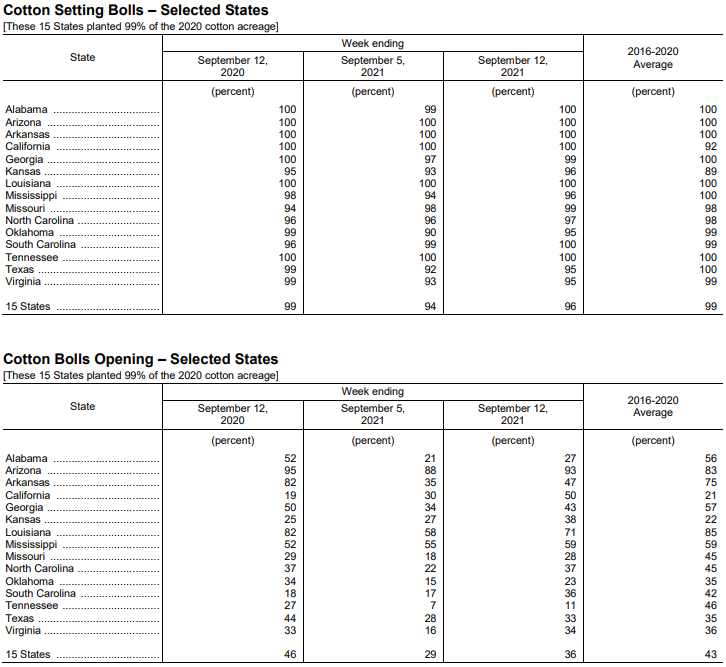 美國農(nóng)業(yè)部9月13日發(fā)布的美國棉花生長報(bào)告顯示,截至9月12日當(dāng)周,美棉結(jié)鈴率為96%,前周為94%,去年同期為99%,五年均值為99%。美棉吐絮率為36%,前周為29%,去年同期為46%,五年均值為43%。美棉收割率為5%,去年同期為6%,五年均值為8%。美棉生長優(yōu)良率為64%,前周為61%,去年同期為45%。