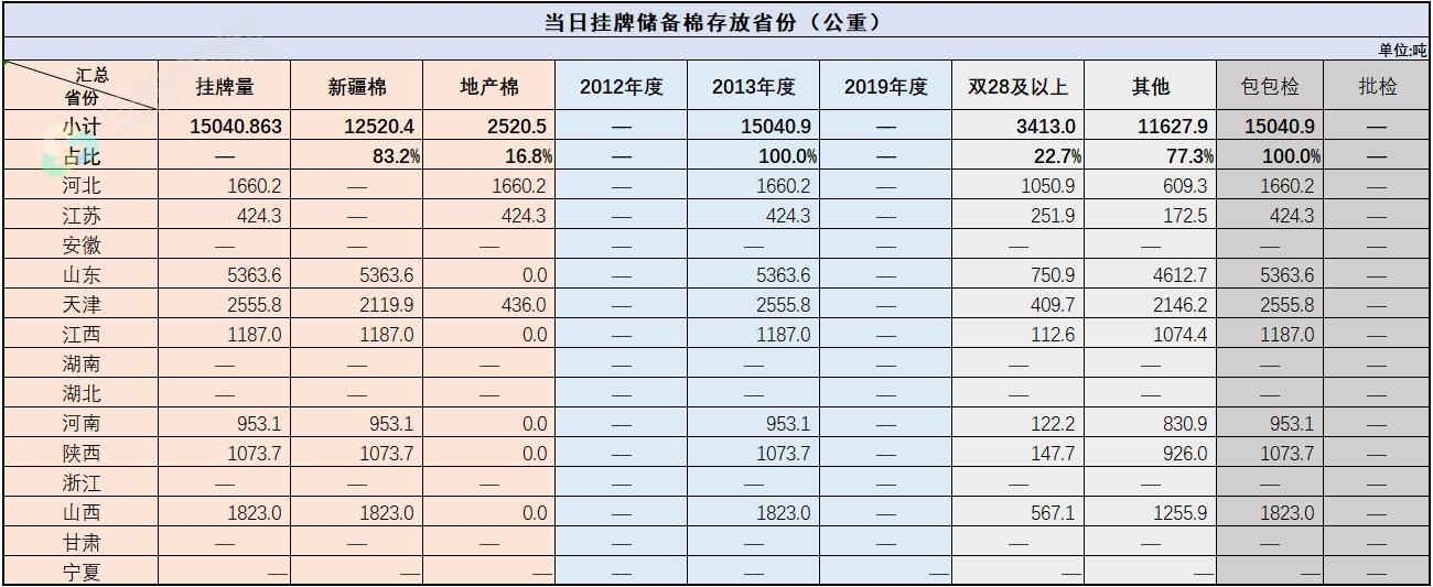 中國(guó)儲(chǔ)備棉管理有限公司定于9月16日通過(guò)全國(guó)棉花交易市場(chǎng)上市銷(xiāo)售中央儲(chǔ)備棉重量15040.863噸,共65捆,其中新疆棉12520.4噸。