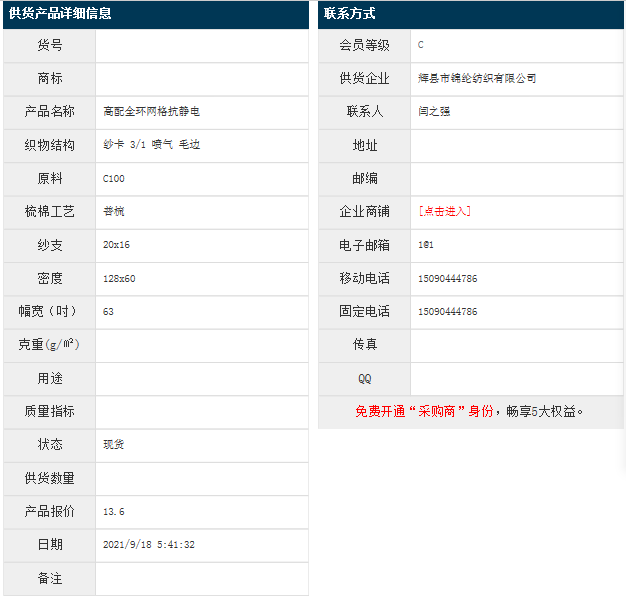 9月18日,輝縣錦綸紡織有限公司高配全環(huán)網(wǎng)格抗靜電C100 20x16 128x60 63" 紗卡 3/1 噴氣 毛邊,報(bào)價(jià)為13.6元/米,實(shí)際成交價(jià)以協(xié)商為準(zhǔn)。[點(diǎn)擊查看詳情]