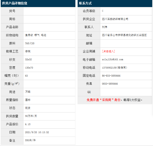 9月20日,四川玉揚紡織有限公司滌棉魚骨紋T65/C35 32x32 130x70 63" 噴氣 毛邊,報價為6.15元/米,實際成交價以協商為準。[點擊查看詳情]