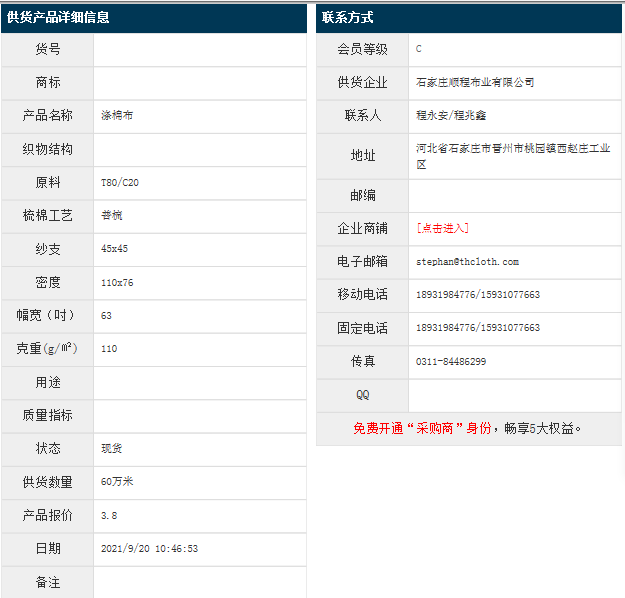 9月20日,石家莊順程布業(yè)有限公司滌棉布T80/C20 45x45 110x76 63" 110g/㎡,報(bào)價(jià)為3.8元/米,實(shí)際成交價(jià)以協(xié)商為準(zhǔn)。[點(diǎn)擊查看詳情]
