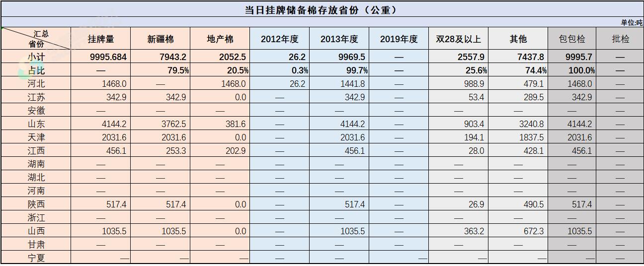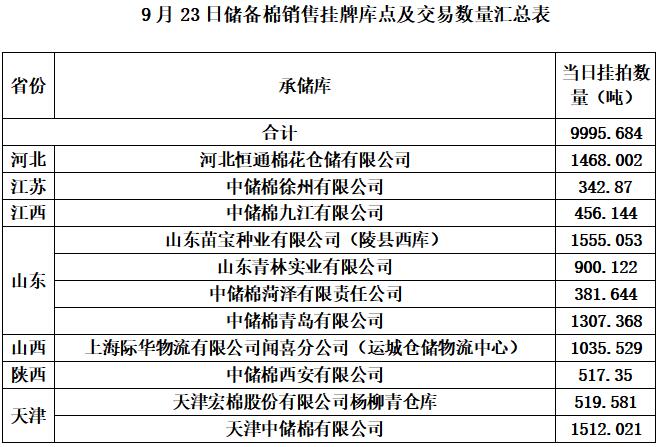 中國儲備棉管理有限公司定于9月23日通過全國棉花交易市場上市銷售中央儲備棉重量9995.684噸,共43捆,其中新疆棉7943.2噸。