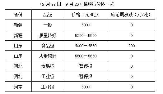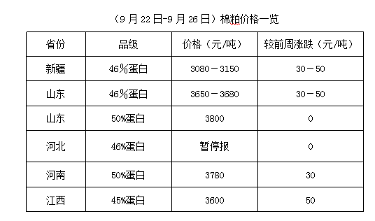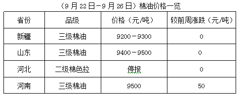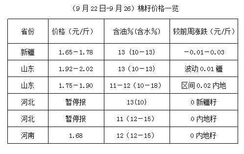 上周(9月22-26日),中秋節(jié)過后,期貨震蕩難穩(wěn),鄭棉、棉紗、豆油、豆粕均出現(xiàn)不同程度調(diào)整,但棉市新舊交替期間,行情變化因素較多,加之部分地區(qū)天氣持續(xù)陰雨,對籽棉上市進度帶來一定阻礙,各方謹慎應(yīng)對。上周棉籽少量上市,價格雖有波動,但大跌暫較困難,多數(shù)油棉廠仍未能入市。棉副產(chǎn)品報價混亂,購銷少量,棉籽集中上市時間仍需等待。