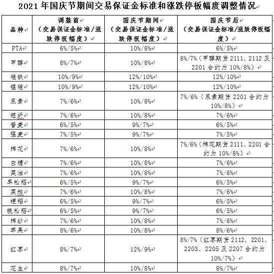 根據《鄭州商品交易所期貨交易風險控制管理辦法》第九條規(guī)定,經研究決定,對2021年國慶節(jié)期間部分期貨合約交易保證金標準和漲跌停板幅度作如下調整:
